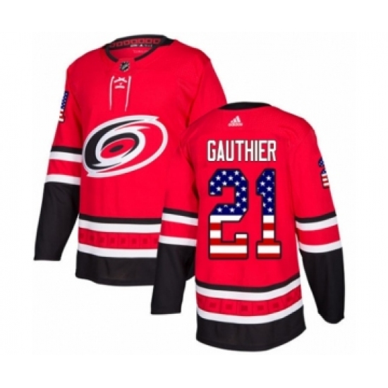 >Men's Adidas Carolina Hurricanes #21 Julien Gauthier Authentic Red USA Flag Fashion NHL Jersey