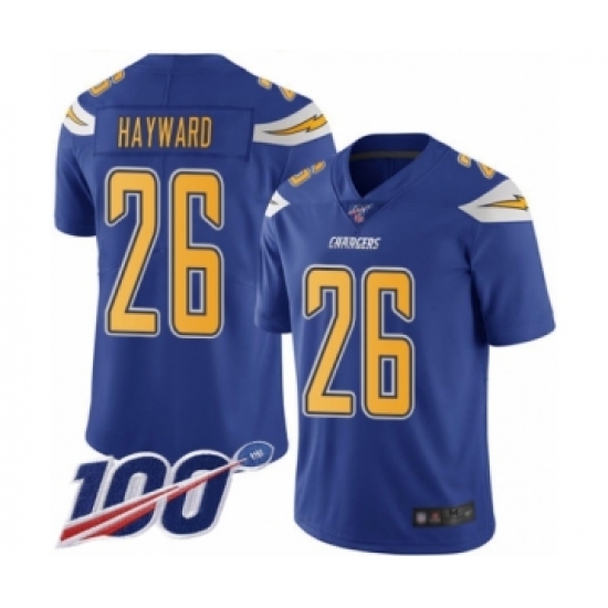 >Men's Los Angeles Chargers #26 Casey Hayward Limited Electric Blue Rush Vapor Untouchable 100th Season Football Jersey