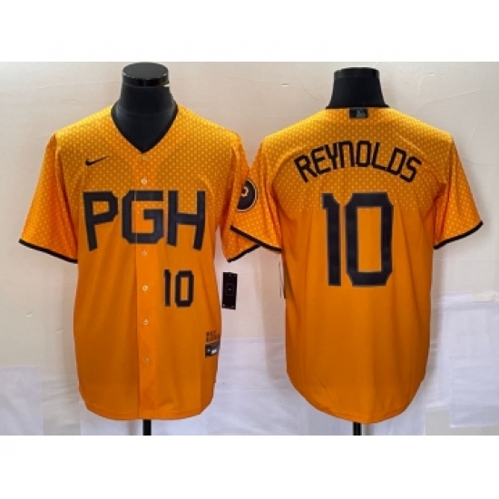 >Men's Nike Pittsburgh Pirates #10 Bryan Reynolds Number Gold 2023 City Connect Stitched Jersey1