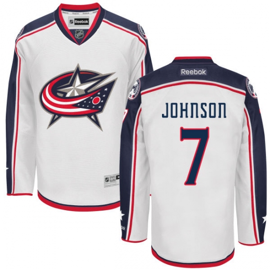 Home>NHL>Columbus Blue Jackets>Jack Johnson>Men's Reebok Columbus Blue Jackets #7 Jack Johnson Authentic White Away NHL Jersey