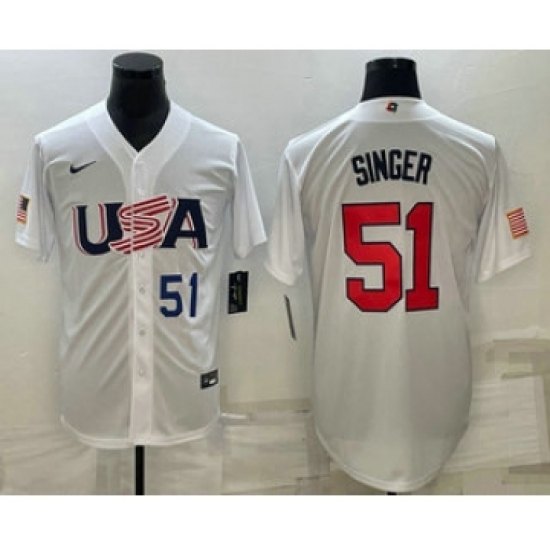 >Men's USA Baseball #51 Brady Singer Number 2023 White World Baseball Classic Stitched Jersey