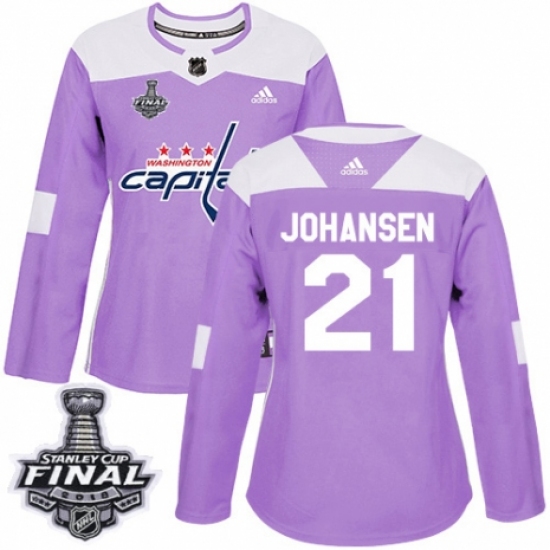 >Women's Adidas Washington Capitals #21 Lucas Johansen Authentic Purple Fights Cancer Practice 2018 Stanley Cup Final NHL Jersey