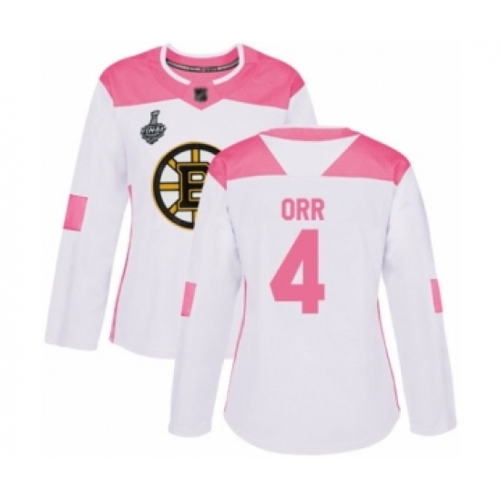 Women's Boston Bruins #4 Bobby Orr Authentic White Pink Fashion 2019 Stanley Cup Final Bound Hockey Jersey