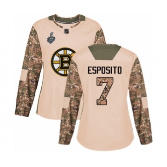 >Women's Boston Bruins #7 Phil Esposito Authentic Camo Veterans Day Practice 2019 Stanley Cup Final Bound Hockey Jersey