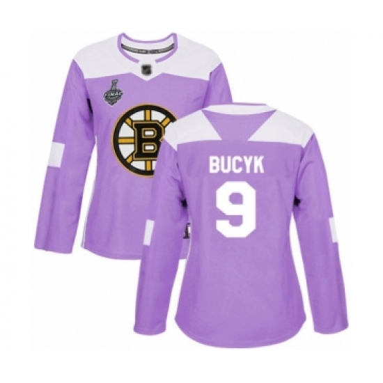 >Women's Boston Bruins #9 Johnny Bucyk Authentic Purple Fights Cancer Practice 2019 Stanley Cup Final Bound Hockey Jersey