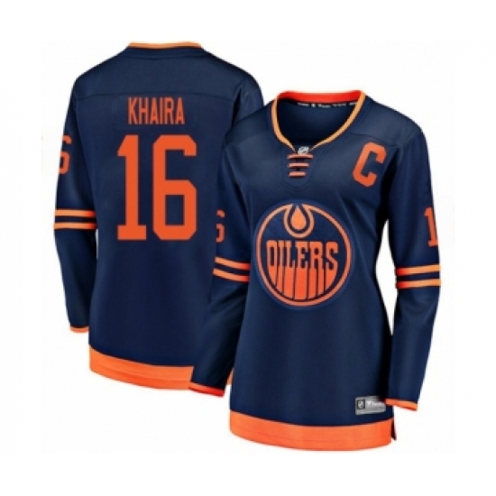 >Women's Edmonton Oilers #16 Jujhar Khaira Authentic Navy Blue Alternate Fanatics Branded Breakaway Hockey Jersey