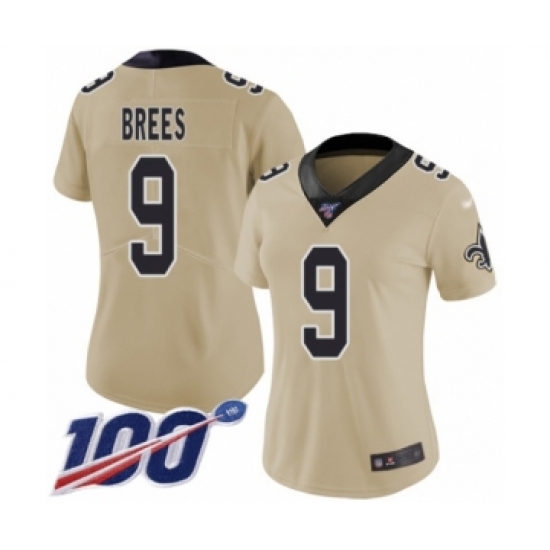 >Women's New Orleans Saints #9 Drew Brees Limited Gold Inverted Legend 100th Season Football Jersey