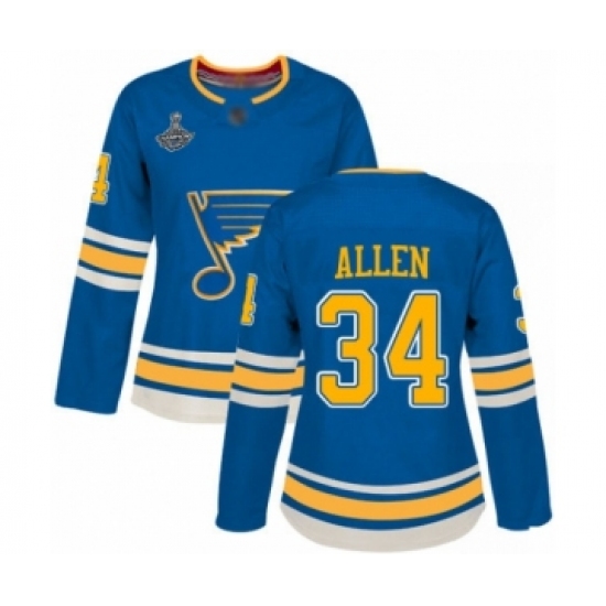 Women's St. Louis Blues #34 Jake Allen Authentic Navy Blue Alternate 2019 Stanley Cup Champions Hockey Jersey