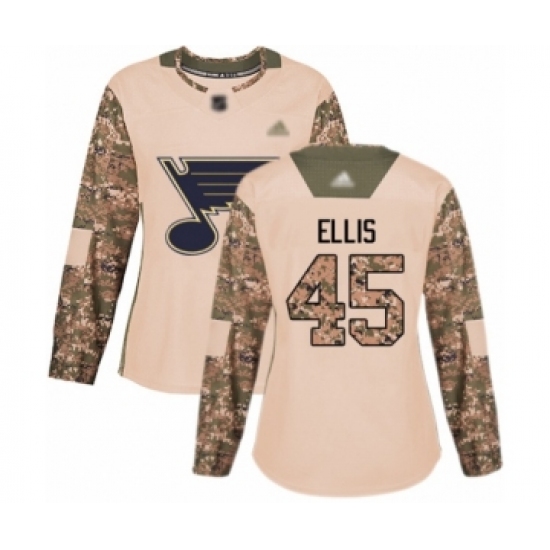 >Women's St. Louis Blues #45 Colten Ellis Authentic Camo Veterans Day Practice Hockey Jersey