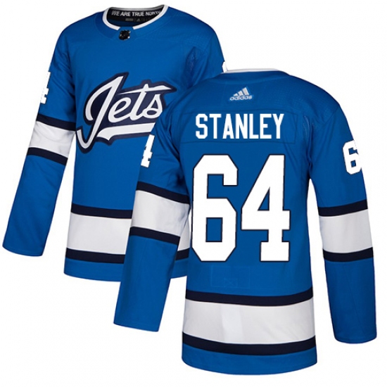 >Youth Adidas Winnipeg Jets #64 Logan Stanley Authentic Blue Alternate NHL Jersey