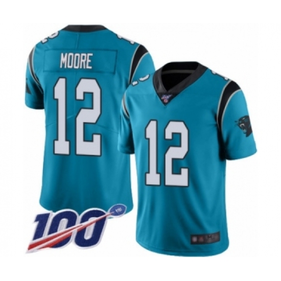 >Men's Carolina Panthers #12 DJ Moore Blue Alternate Vapor Untouchable Limited Player 100th Season Football Jersey