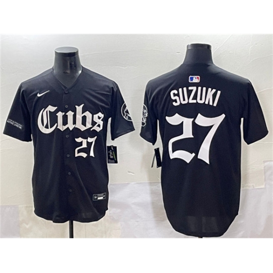 >Men's Chicago Cubs #27 Seiya Suzuki Black 'Gothic North Side Edition' Vapor Premier Limited Stitched Baseball Jersey