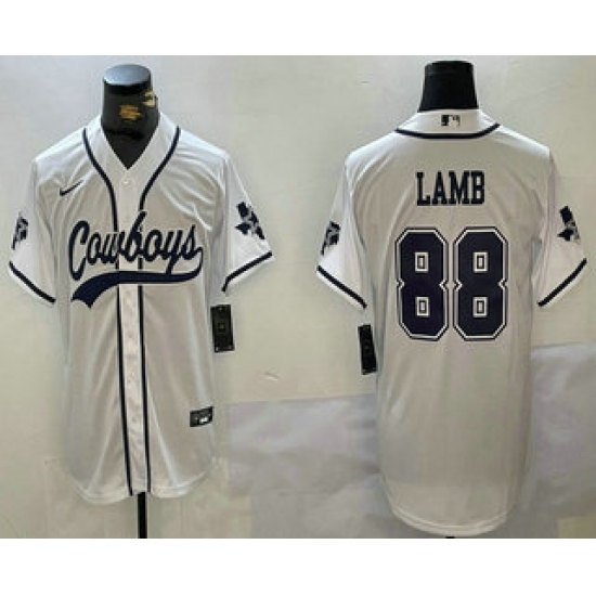 >Men's Dallas Cowboys #88 CeeDee Lamb White With Navy Name Cool Base Stitched Baseball Jersey