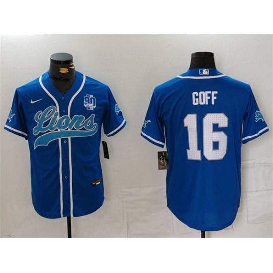 Men's Detroit Lions #16 Jared Goff Blue With 90th Anniversary Cool Base Stitched Baseball Jersey