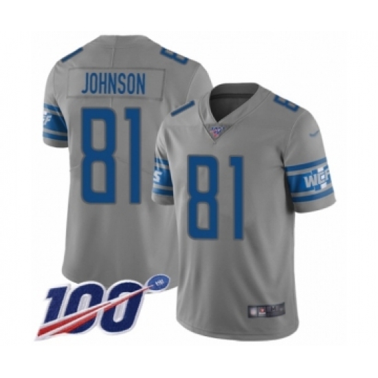 >Men's Detroit Lions #81 Calvin Johnson Limited Gray Inverted Legend 100th Season Football Jersey