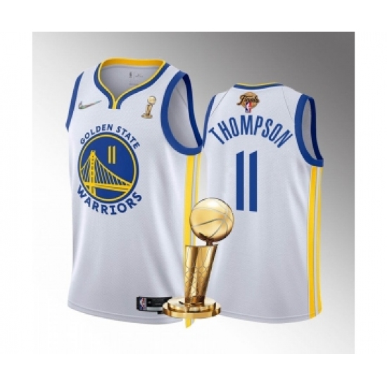 >Men's Golden State Warriors #11 Klay Thompson White 2022 NBA Finals Champions Stitched Jersey