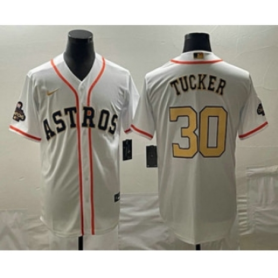 Men's Houston Astros #30 Kyle Tucker 2023 White Gold World Serise Champions Cool Base Stitched Jersey