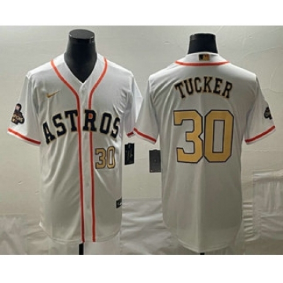 >Men's Houston Astros #30 Kyle Tucker Number 2023 White Gold World Serise Champions Cool Base Stitched Jersey1