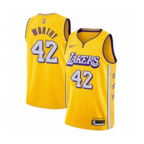 >Men's Los Angeles Lakers #42 James Worthy Swingman Gold 2019-20 City Edition Basketball Jersey