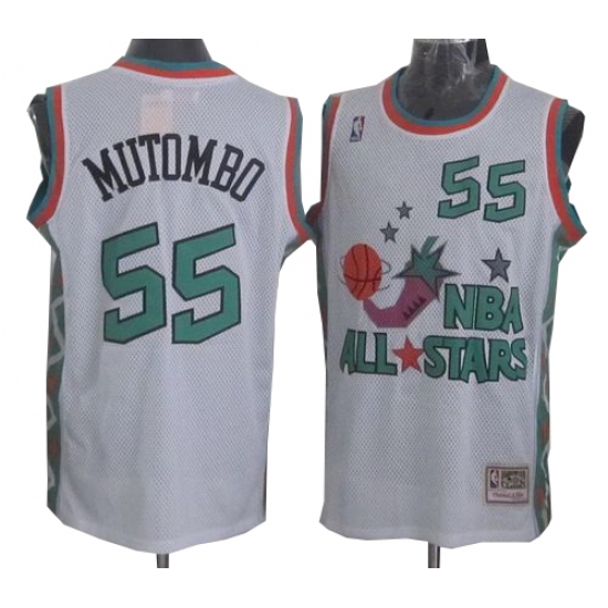 Home>NBA>Denver Nuggets>Dikembe Mutombo>Men's Mitchell and Ness Denver Nuggets #55 Dikembe Mutombo Authentic White 1996 All Star Throwback NBA Jersey