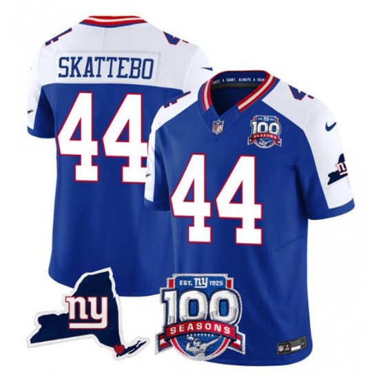 >Men's New York Giants #44 Cam Skattebo Royal White 2025 Draft F.U.S.E. 100th Season & State Vapor Limited Football Stitched Jersey