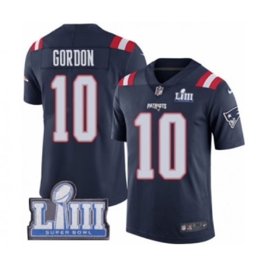 >Men's Nike New England Patriots #10 Josh Gordon Limited Navy Blue Rush Vapor Untouchable Super Bowl LIII Bound NFL Jersey