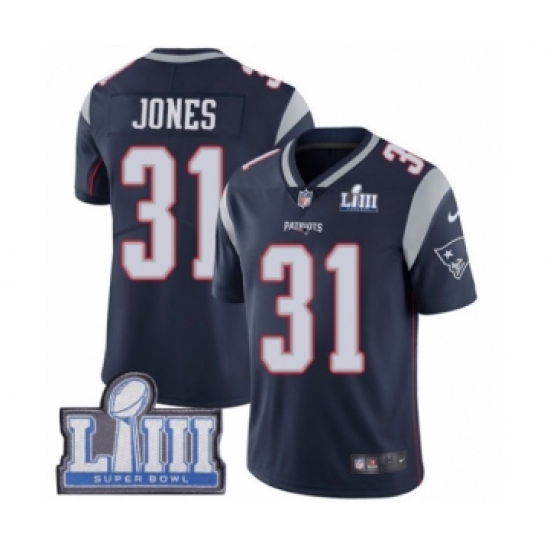 >Men's Nike New England Patriots #31 Jonathan Jones Navy Blue Team Color Vapor Untouchable Limited Player Super Bowl LIII Bound NFL Jersey