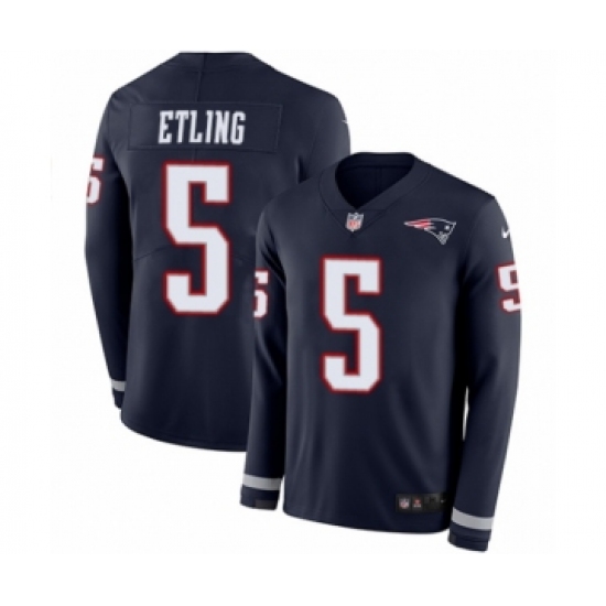 >Men's Nike New England Patriots #5 Danny Etling Limited Navy Blue Therma Long Sleeve NFL Jersey