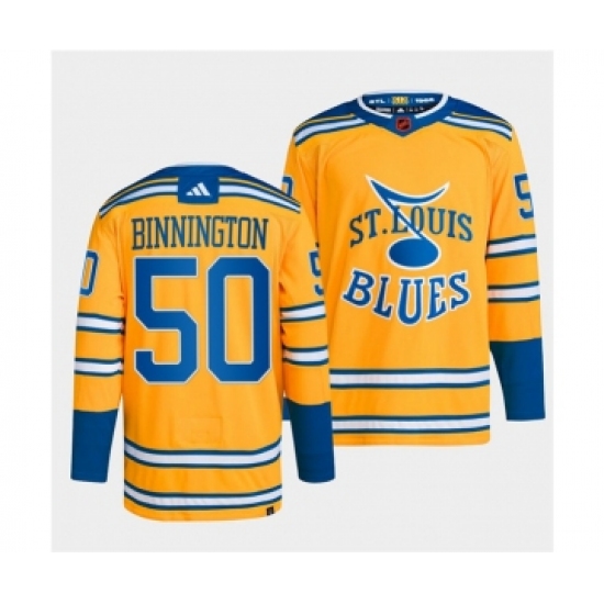 >Men's St. Louis Blues #50 Jordan Binnington Yellow 2022-23 Reverse Retro Stitched Jersey