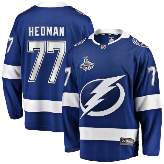 >Men's Tampa Bay Lightning #77 Victor Hedman Fanatics Branded Blue Home 2020 Stanley Cup Champions Breakaway Jersey