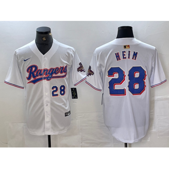 >Men's Texas Rangers #28 Jonah Heim Number White 2023 World Series Champions Cool Base Jerseys