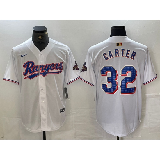 Men's Texas Rangers #32 Evan Carter White 2023 World Series Champions Cool Base Jersey