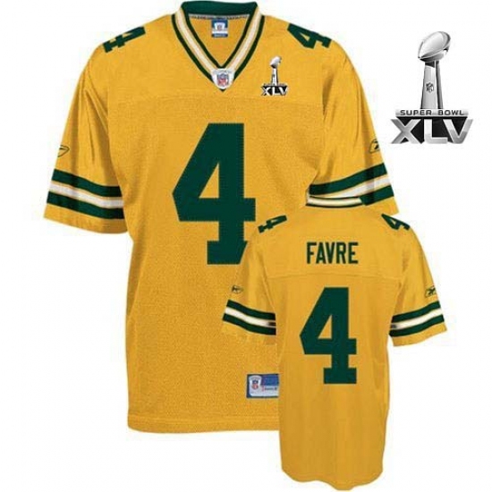 The high-quality Reebok Green Bay Packers #4 Brett Favre Yellow 2011 Super Bowl XLV Premier EQT Throwback NFL Jersey is made of heavier fabric, with nylon diamond weave mesh. This team-colored jersey showcases the embroidered NFL® Equipment patch at the point on the v-neck collar and a team specific jock tag at the lower left front above the hem. The officially licensed Premier jersey proudly displays the sewn on, single-layer tackle twill team graphics at the chest, back and sleeves. Players name which is stiched shown at the upper back on a sewn down nameplate, The players number which 100% stitched is displayed in tackle twill on the chest, back and sleeves, NFL® Equipment jock tag shown at lower left front above the hem, Decorated in the team colors, Officially licensed