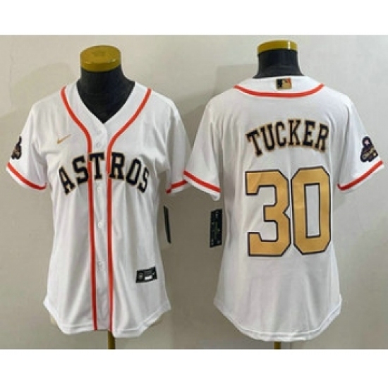 >Women's Houston Astros #30 Kyle Tucker 2023 White Gold World Serise Champions Cool Base Stitched Jersey