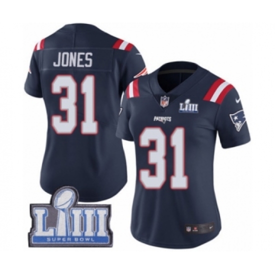 >Women's Nike New England Patriots #31 Jonathan Jones Limited Navy Blue Rush Vapor Untouchable Super Bowl LIII Bound NFL Jersey