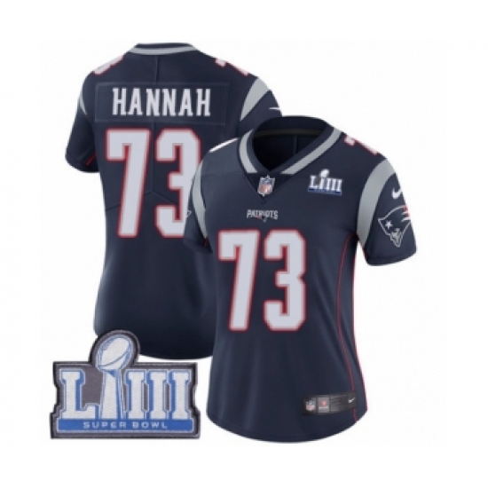 >Women's Nike New England Patriots #73 John Hannah Navy Blue Team Color Vapor Untouchable Limited Player Super Bowl LIII Bound NFL Jersey