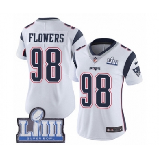 >Women's Nike New England Patriots #98 Trey Flowers White Vapor Untouchable Limited Player Super Bowl LIII Bound NFL Jersey