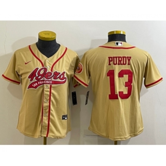>Women's San Francisco 49ers #13 Brock Purdy Gold With Patch Cool Base Stitched Baseball Jersey