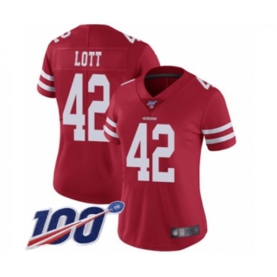 Women's San Francisco 49ers #42 Ronnie Lott Red Team Color Vapor Untouchable Limited Player 100th Season Football Jersey