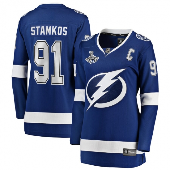 >Women's Tampa Bay Lightning #91 Steven Stamkos Fanatics Branded Blue Home 2020 Stanley Cup Champions Breakaway Jersey