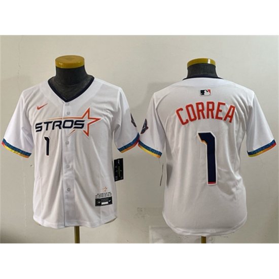 >Youth Houston Astros #1 Carlos Correa White 2025 City Connect Limited Stitched Baseball Jersey