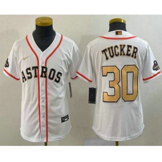 >Youth Houston Astros #30 Kyle Tucker 2023 White Gold World Serise Champions Cool Base Stitched Jersey
