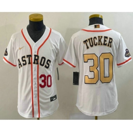 >Youth Houston Astros #30 Kyle Tucker Number 2023 White Gold World Serise Champions Cool Base Stitched Jersey