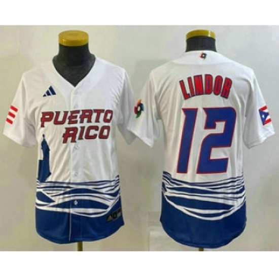 Youth Puerto Rico Baseball #12 Francisco Lindor 2023 White World Baseball Classic Stitched Jerseys